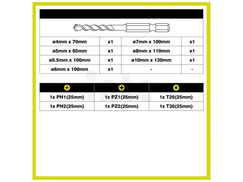 - 7× vrtáky do zdiva: 4 mm, 5 mm, 5,5 mm, 6 mm, 7 mm, 8 mm, 10 mm