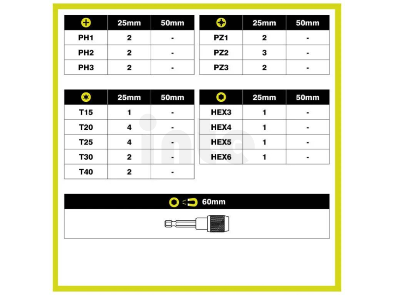 - 30× šroubovací bity (25 mm): PH: 2× PH1, 2× PH2, 2× PH3, PZ: 2× PZ1, 3× PZ2, 2× PZ3, HEX: 1× H3, 1× H4, 1× H5, 1× H6, TORX: 1× TX15,